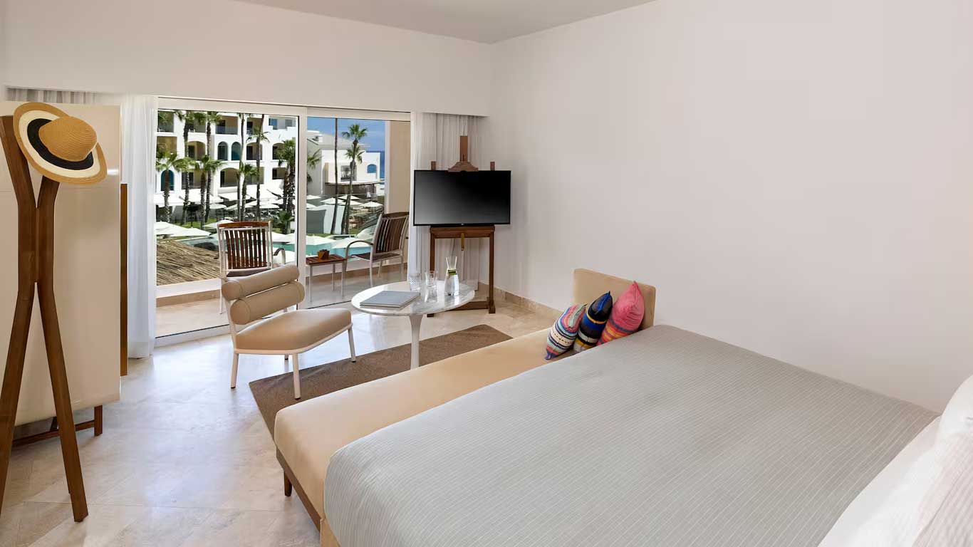The Always ME Leveled Up Rooms at Me Cabo Resort invite you to step onto your private balcony and take in breathtaking views of the desert gardens, the sparkling pool, or the crystal-clear blue waters of the Sea of Cortez.