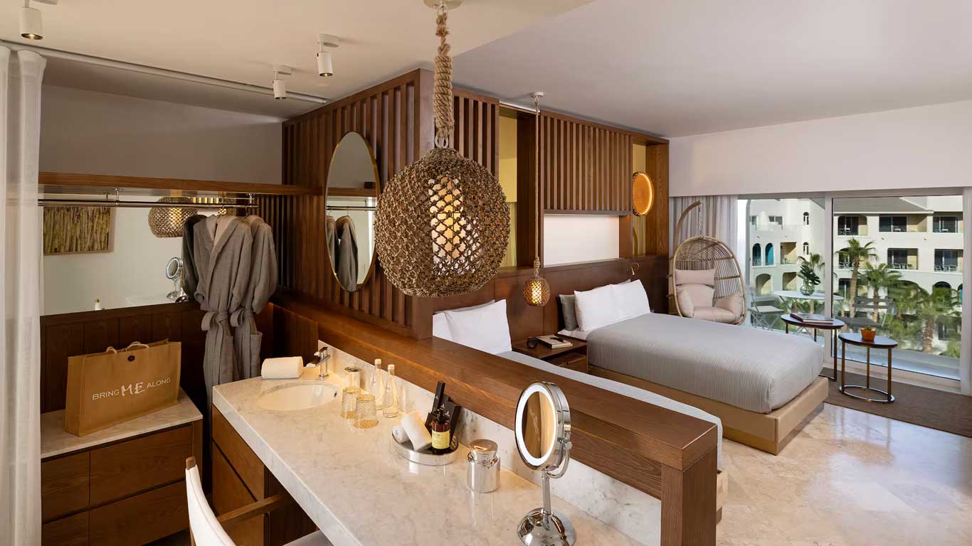 The Superior ME+ Rooms at Me Cabo feature sleek, contemporary interiors that open out into a private, with 40 m2 / 425 sq. Ft, furnished terrace overlooking the glistening ocean. With ME+ services also at your fingertips, this is truly a VIP experience. Discover the meaning of Baja “California dreaming” in our Superior ME+ rooms, featuring a large king size bed and 300-thread count bedding. Each offers plush, contemporary interiors and statement windows that open out into a private, furnished terrace overlooking the sun-kissed Gulf of California. A generously stocked maxibar with in-room coffee service indulges your food or caffeine cravings, while flat screen TVs with satellite channels and mobile connectivity turn your suite into the ultimate refuge. Our bathrooms promise relaxation with a jet shower, bathrobes, slippers and premium amenities.